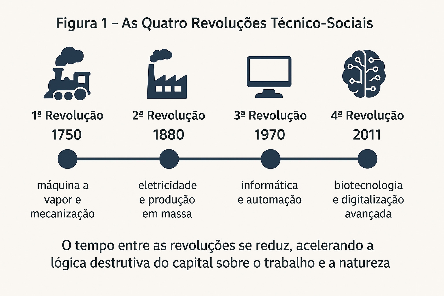 Assim, a diminuição dos intervalos entre as revoluções industriais evidencia a aceleração histórica da técnica subordinada às determinações do capital, isto é, à produção e reprodução do mais-valor, da mercadoria. Essa aceleração, longe de trazer progresso, intensifica a destruição do trabalho como vínculo social e da Natureza como condição de vida. Trata-se, portanto, de um processo que não é neutro, mas profundamente condicionado pelas contradições inerentes ao próprio modo de produção capitalista, que nada tem de sustentável, seja do ponto de vista ambiental, seja da vida humana.