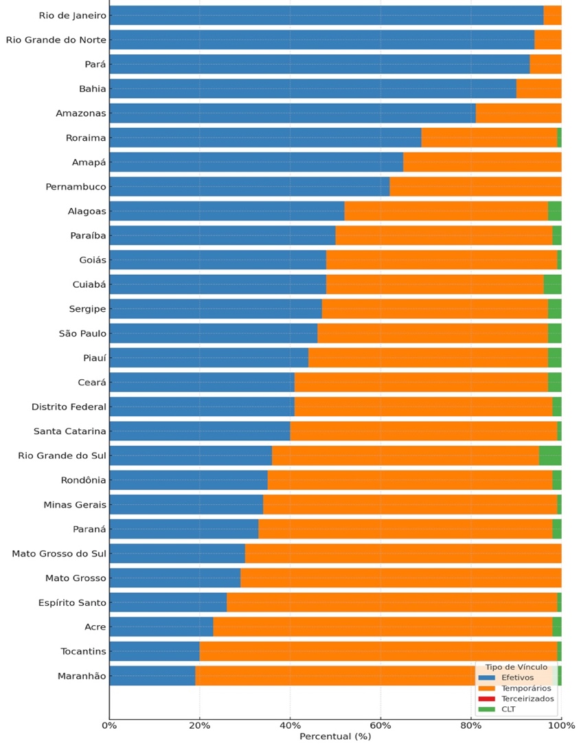 Considerando-se as relações laborais por estado, temos que a grande maioria deles adota contratos temporários em 2023, chegando a mais de 80% dos docentes no caso de Minas Gerais (Gráfico 2).