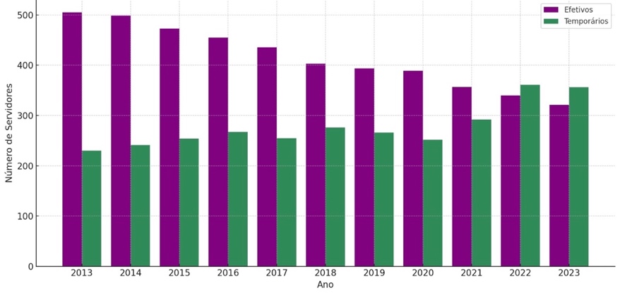 O Processo de trabalho que é alterado pelas inovações digitais, intensificadas na Pandemia da Covid-19, com difusão, por exemplo, do teletrabalho. Longe de ampliar o “tempo livre”, este gerou jornadas extensas, sobreposição entre trabalho e vida doméstica e adoecimento docente. As Relações laborais tornam-se mais precarizadas em consequência das formas mais flexíveis de trabalho por meio de terceirizações e de contratos temporários, ao mesmo tempo em que ocorre a redução de concursos públicos, conforme Gráfico 1 e gráfico 2.
